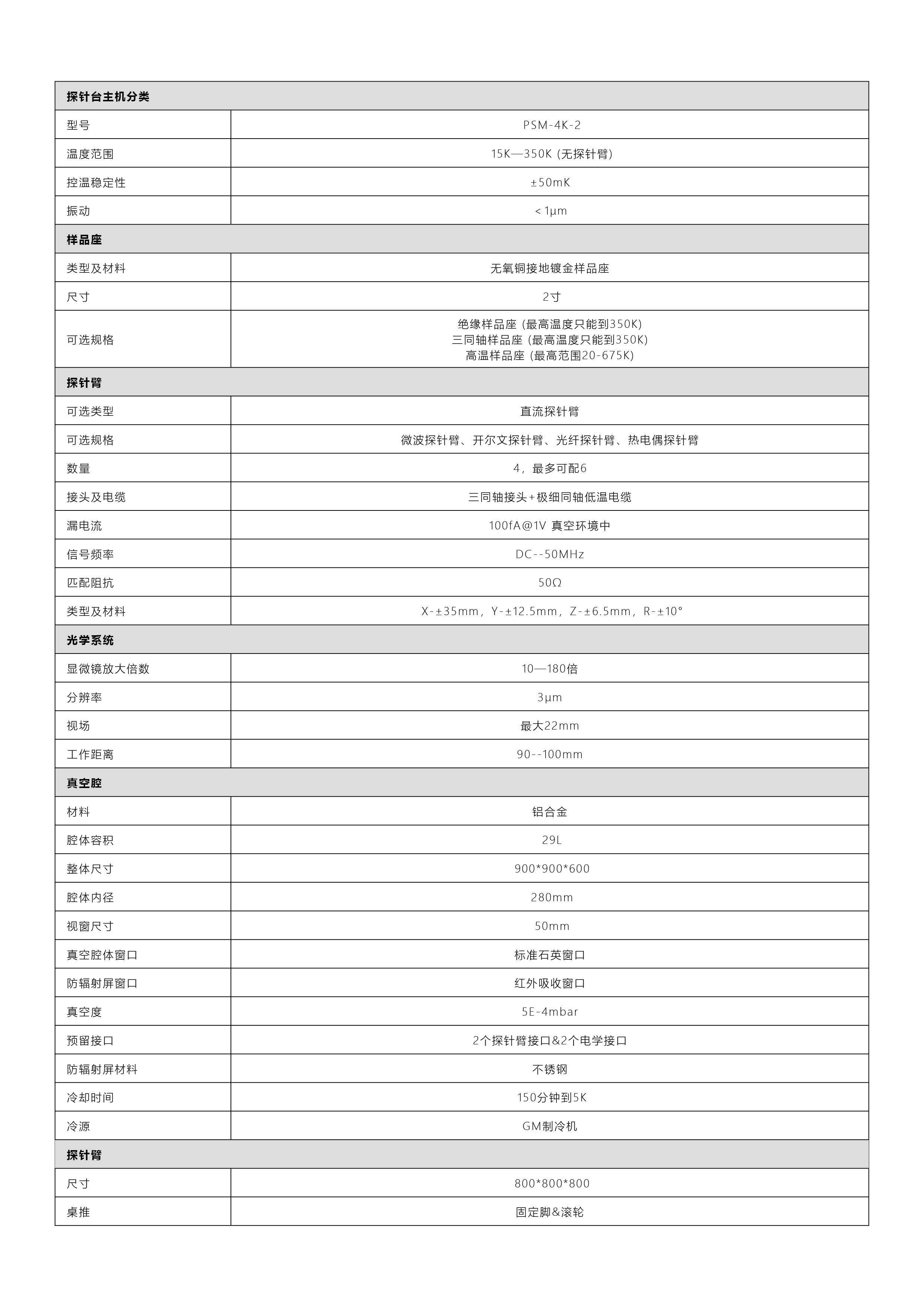 • 温度范围:15K~350K(无探针臂),支持全温区连续精确控温。宽温区能够模拟多种极端与常规的温度环境,满足不同材料在各种温度条件下的特性科研需求